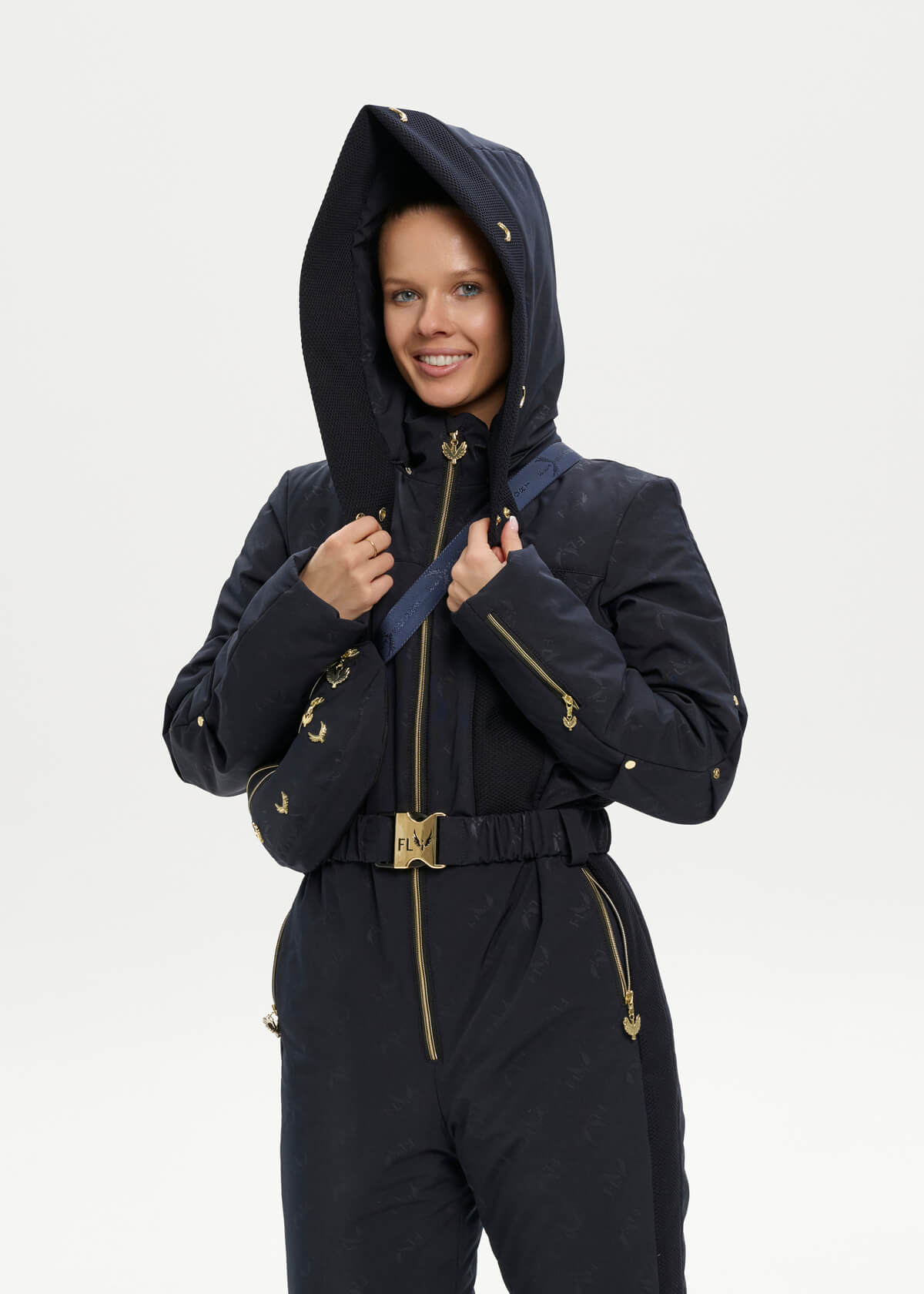 This deep hooded jumpsuit is adorned with gold fly hardware on the front.