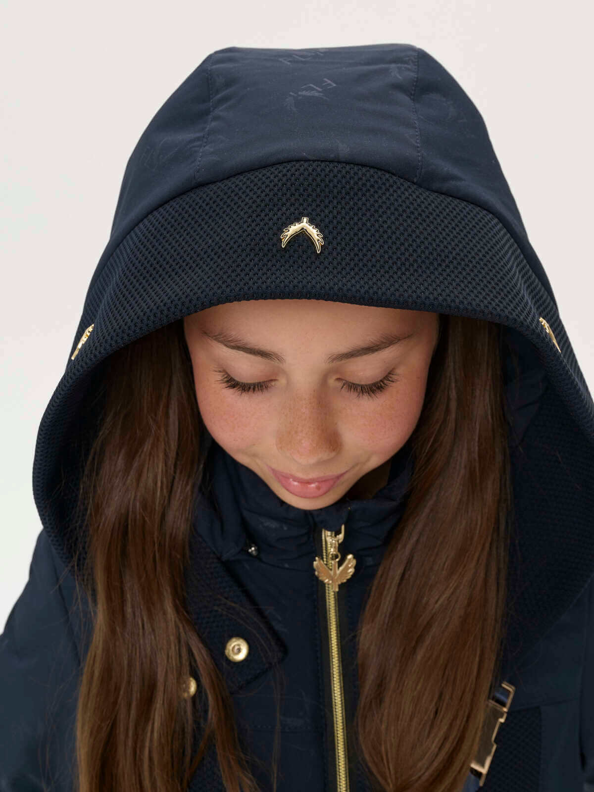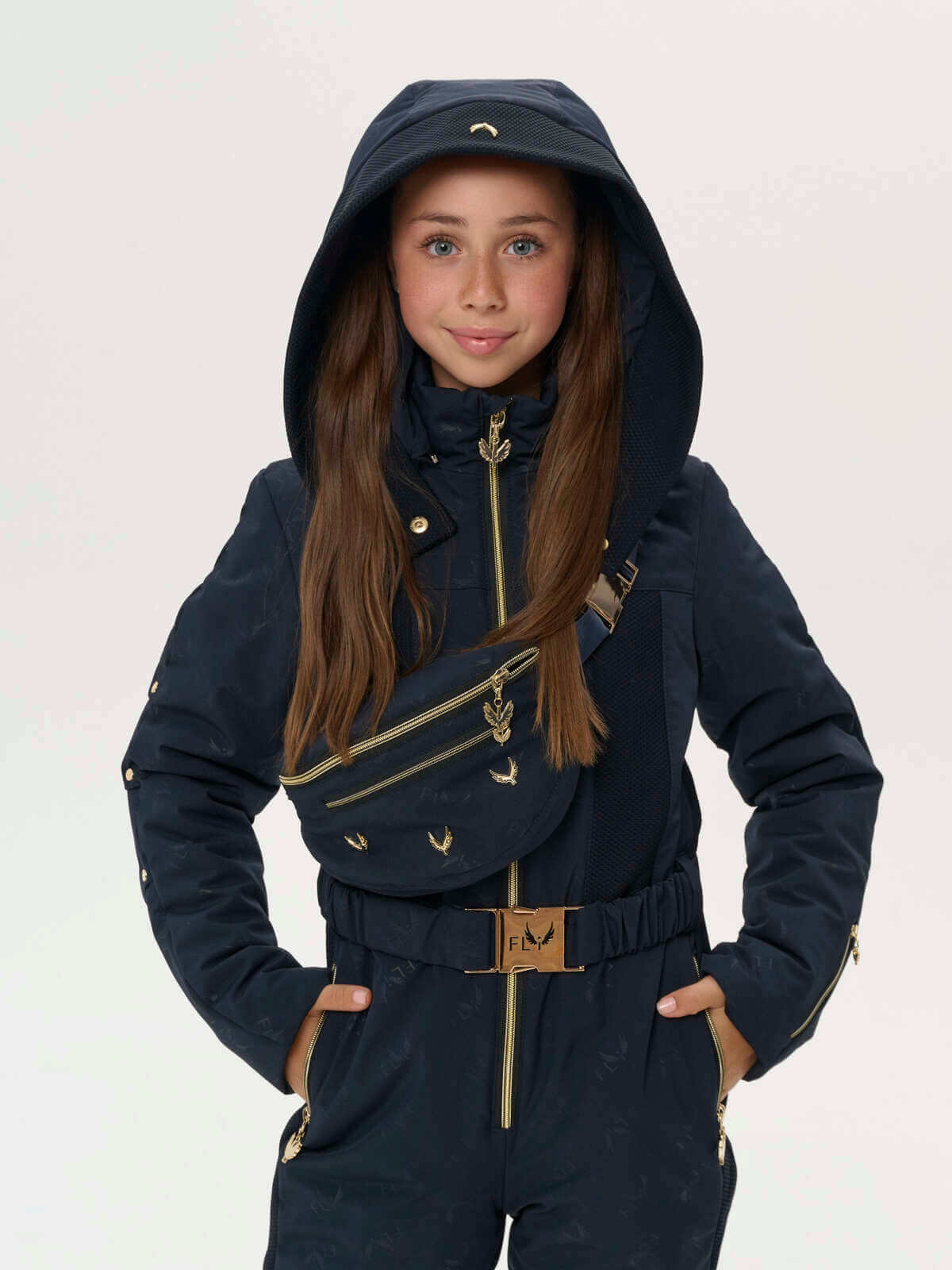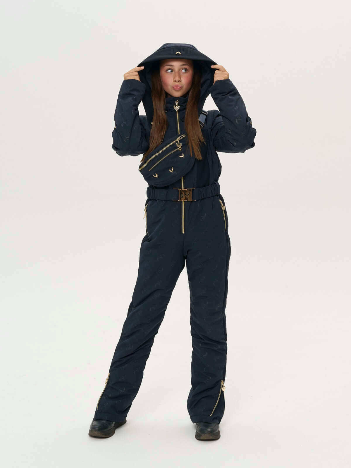 This deep hooded jumpsuit is adorned with gold fly hardware on the front.