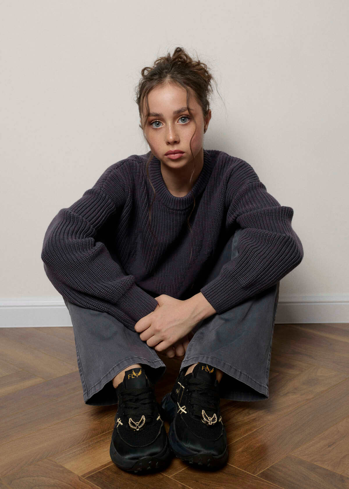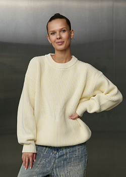 Chic knitted jumpers in milky and graphite. Logo knitted in the center.
