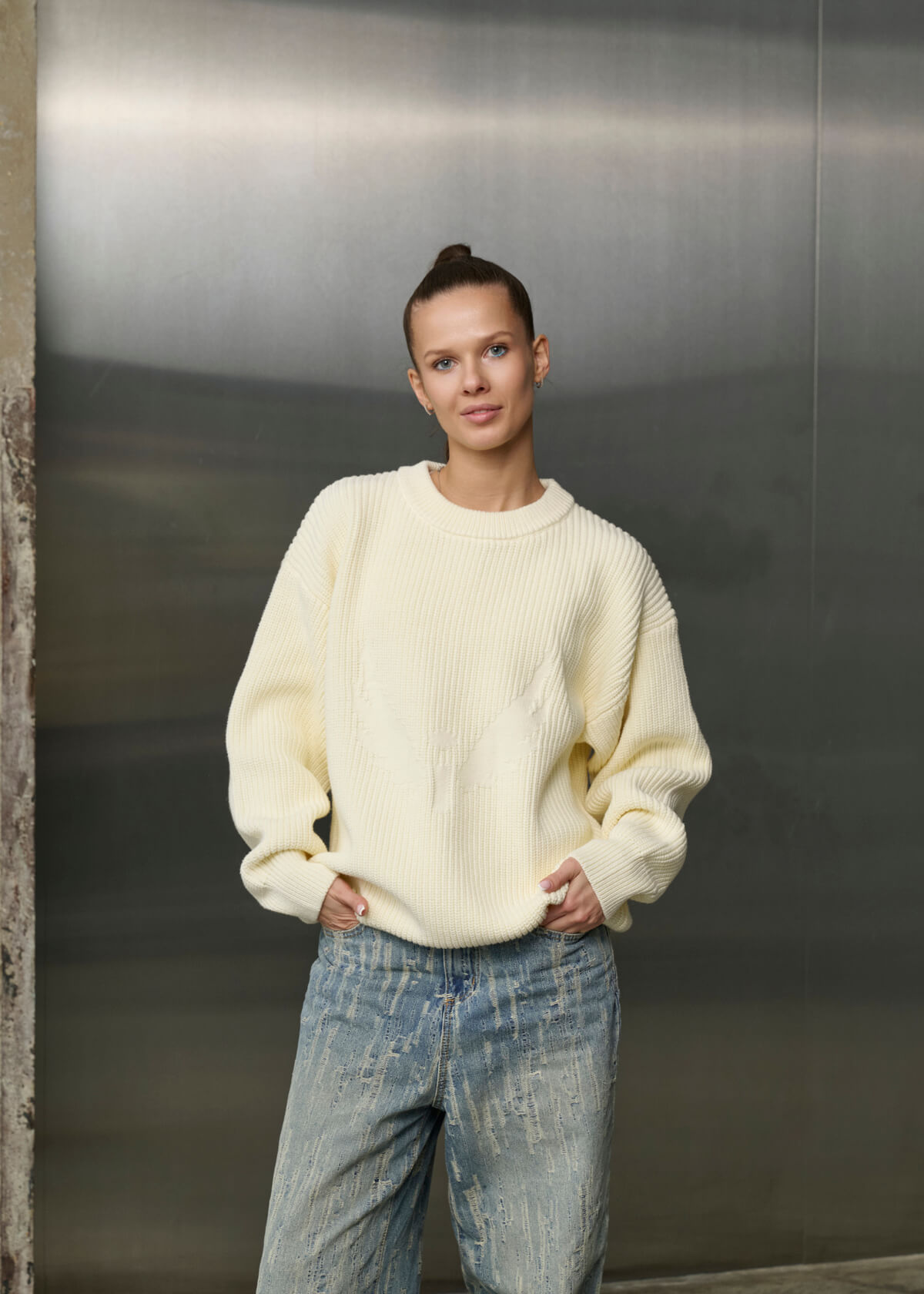 Chic knitted jumpers in milky and graphite. Logo knitted in the center.