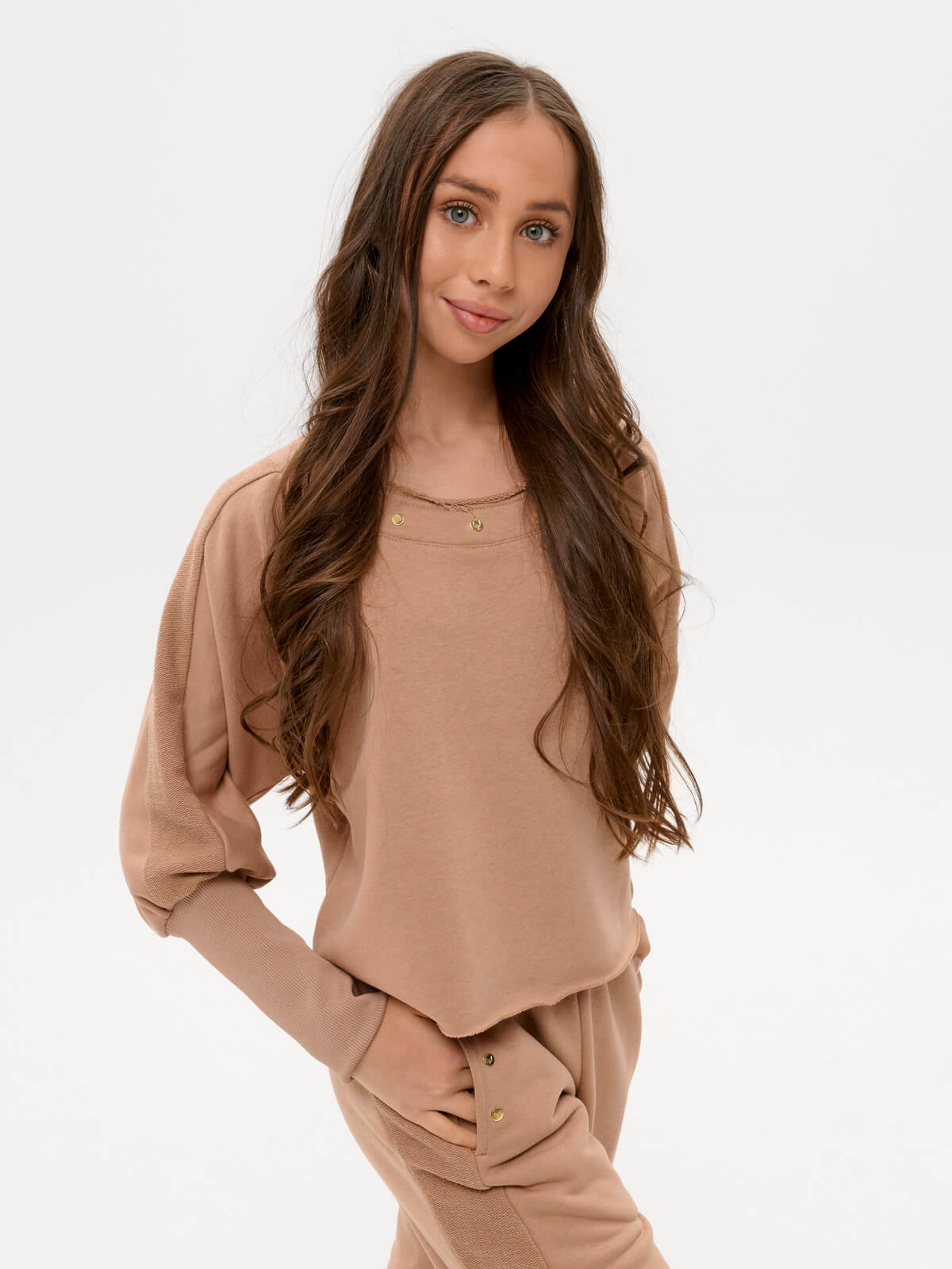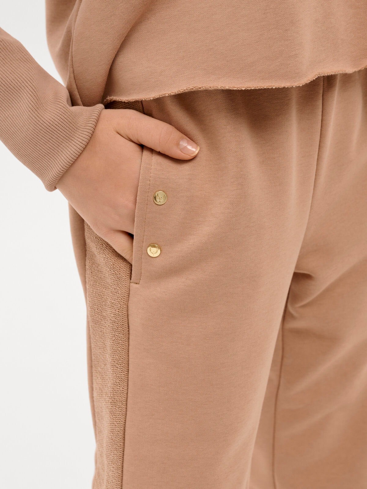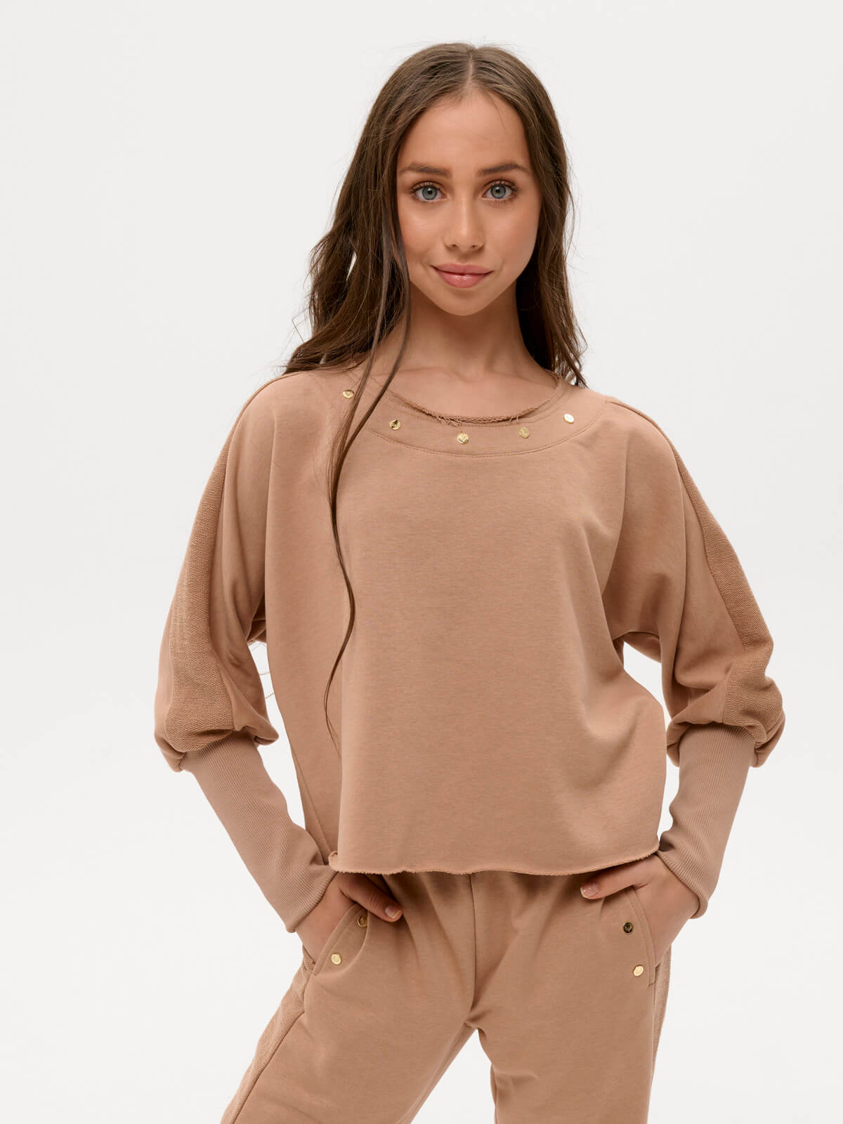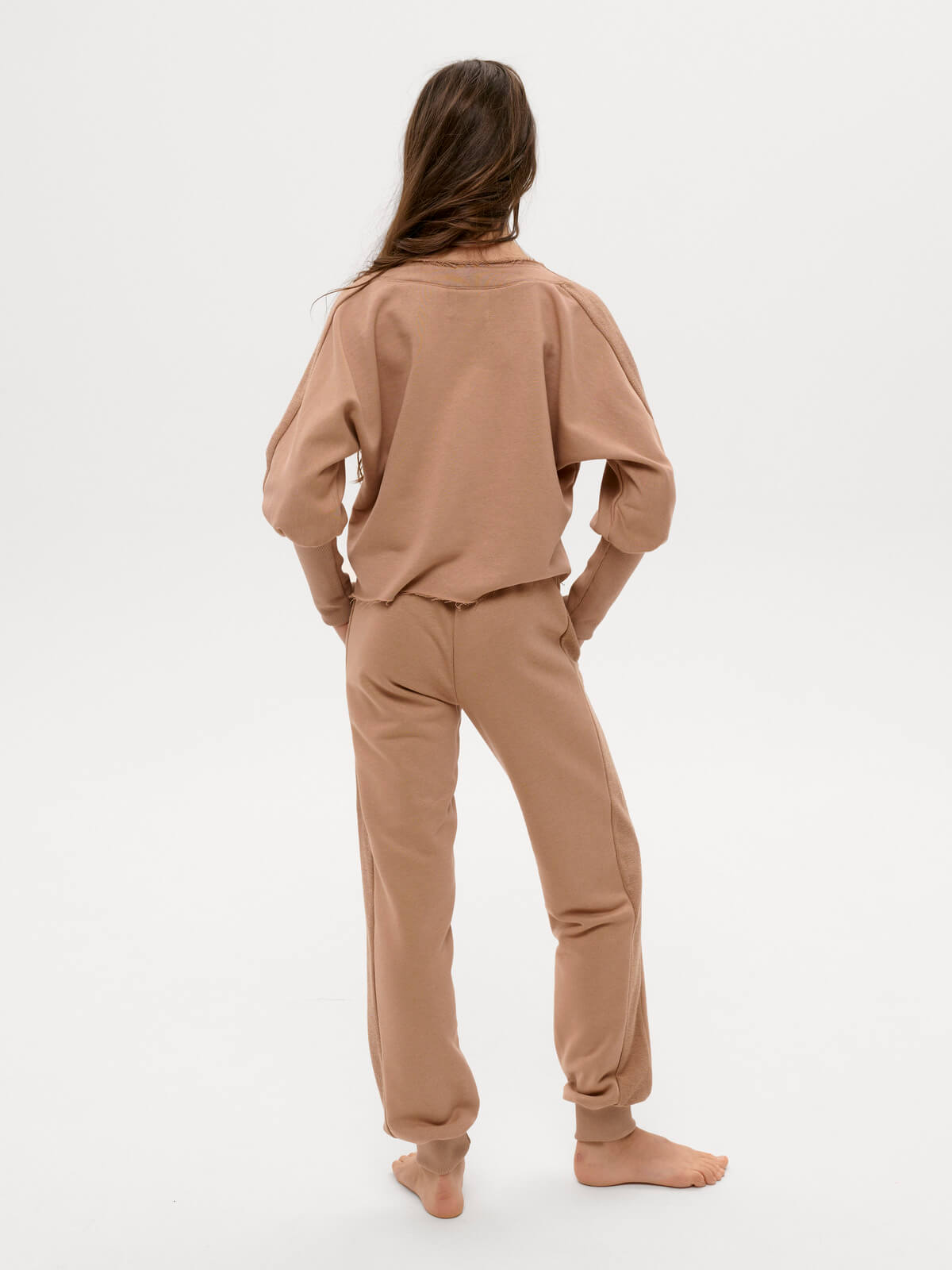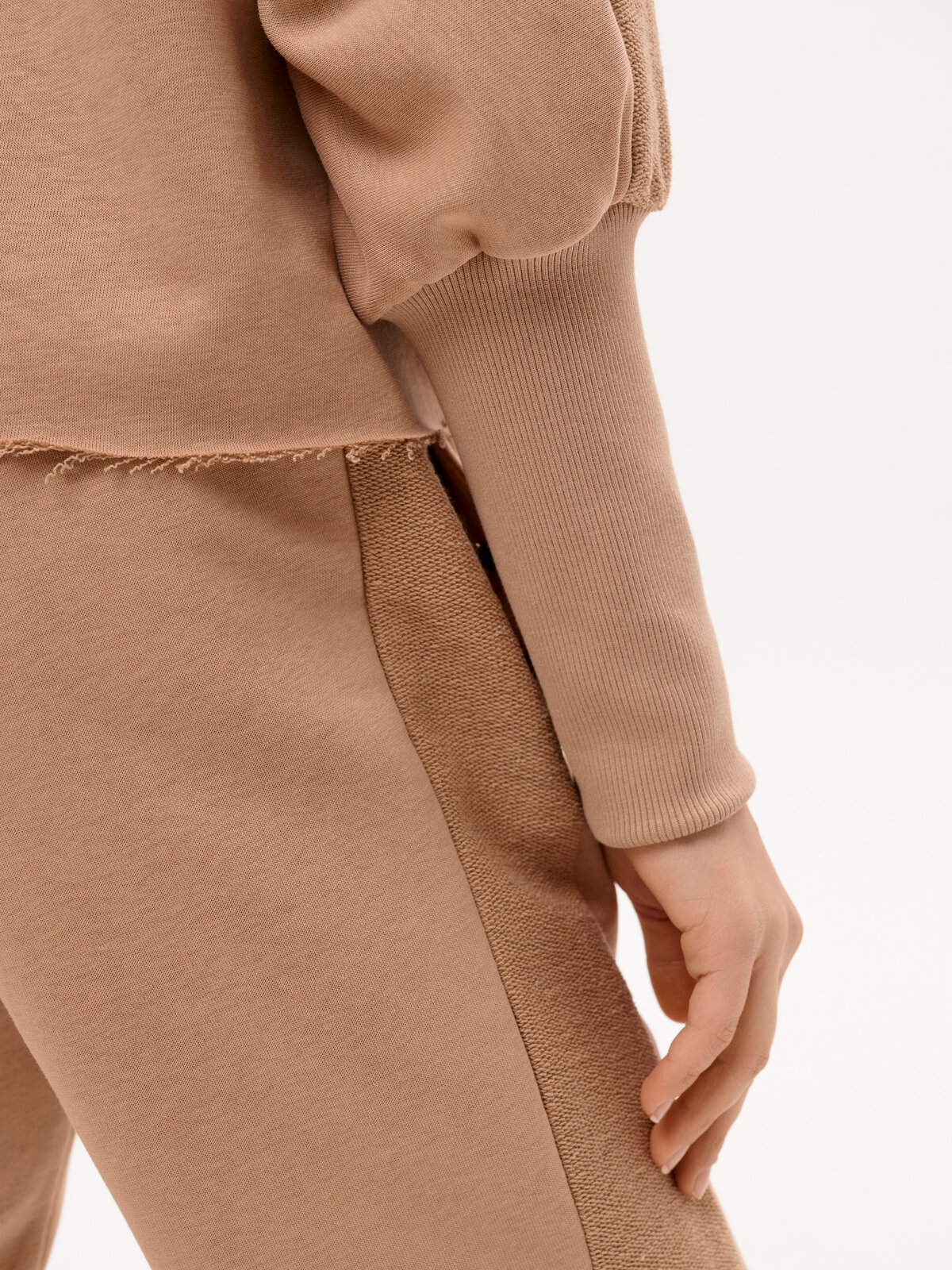 This thick knit suit in a sandy nude color consists of trousers and a sweatshirt. The trousers have a cuffed bottom, an elastic waistband with stripes, and side pockets with a metallic signature detail. The sweatshirt has one-piece sleeves, stripes, and a high cuff. The neckline is decorative, with a metallic signature detail. The hem and neckline are unfinished and roll slightly over the face. The maximum size fits heights 160-164 (hip circumference 88 cm!). Customization is technically not possible.