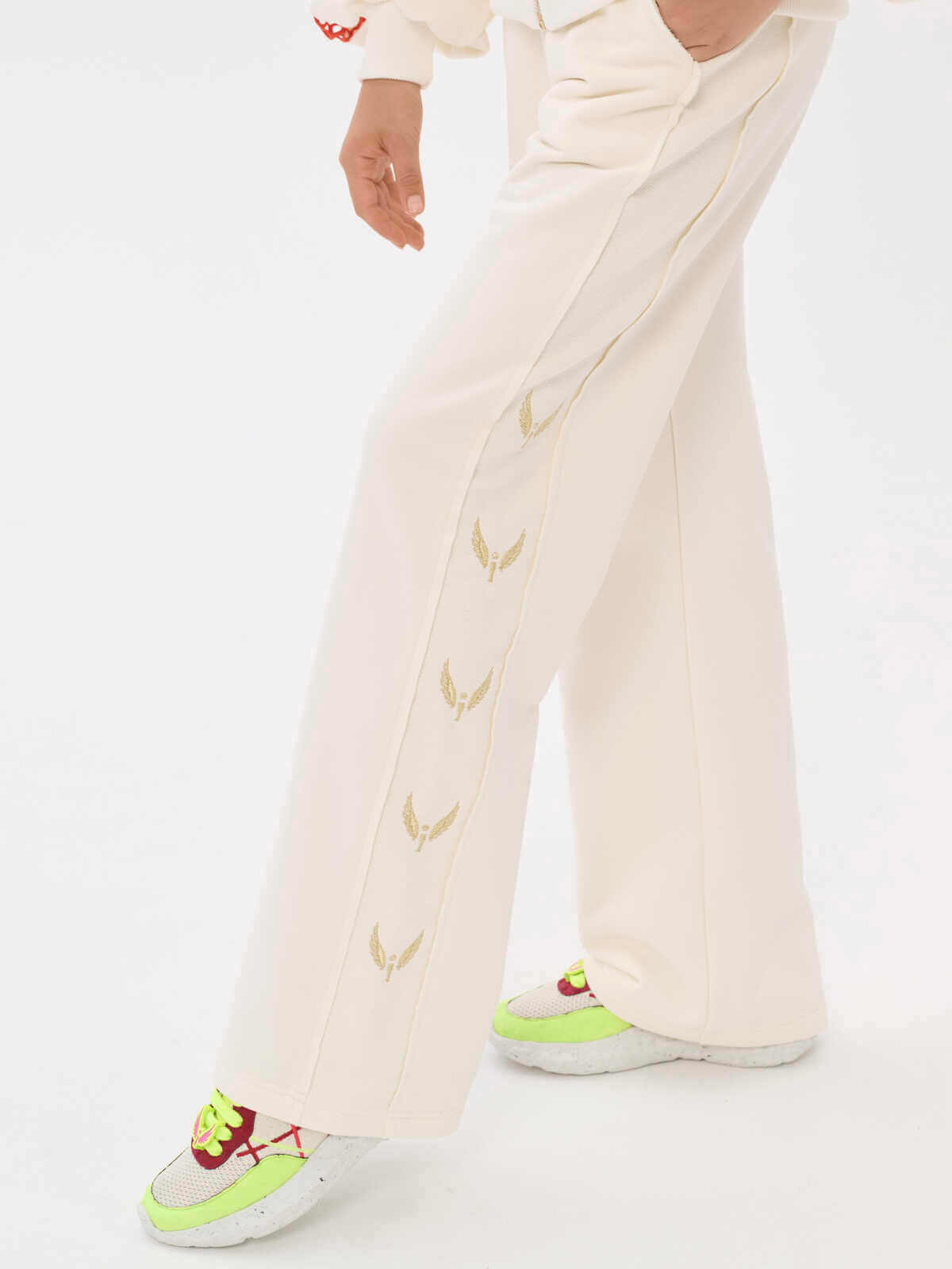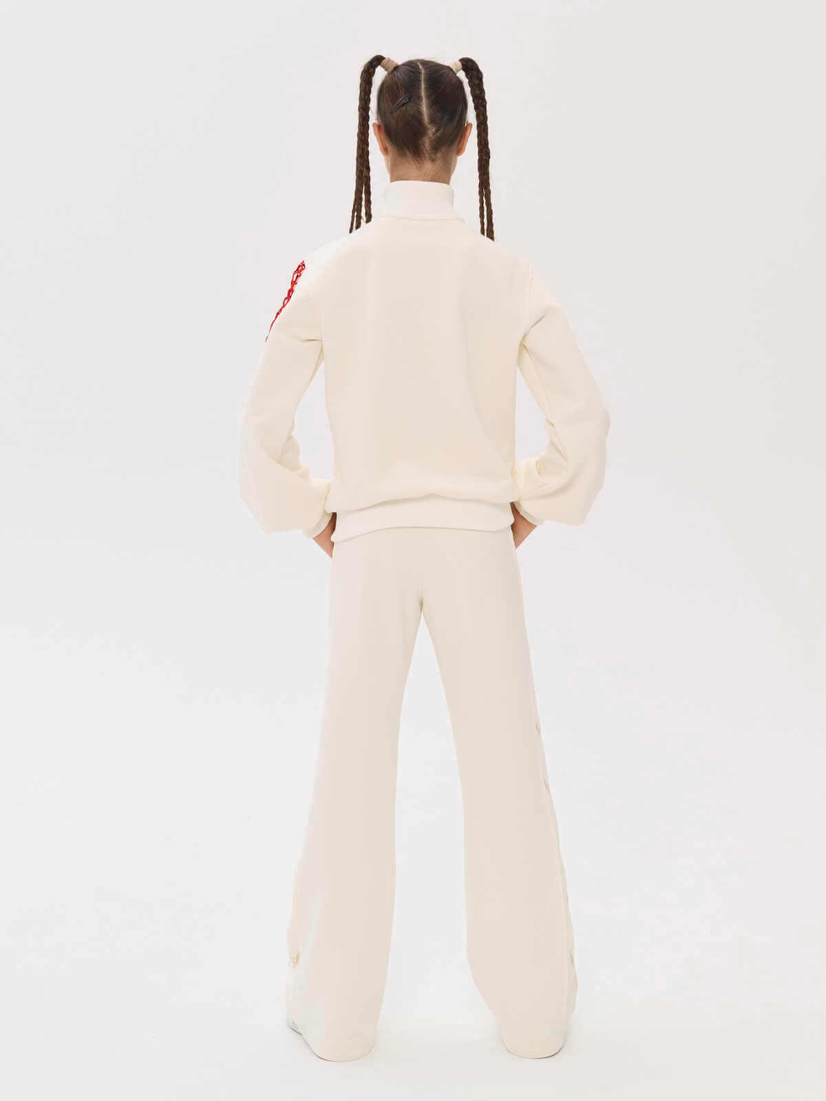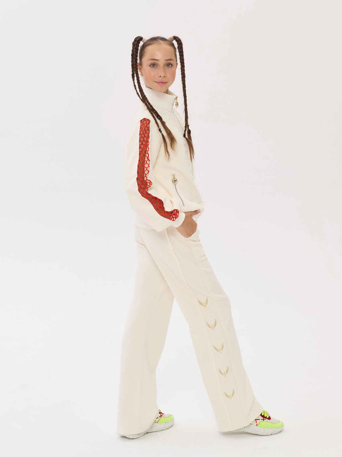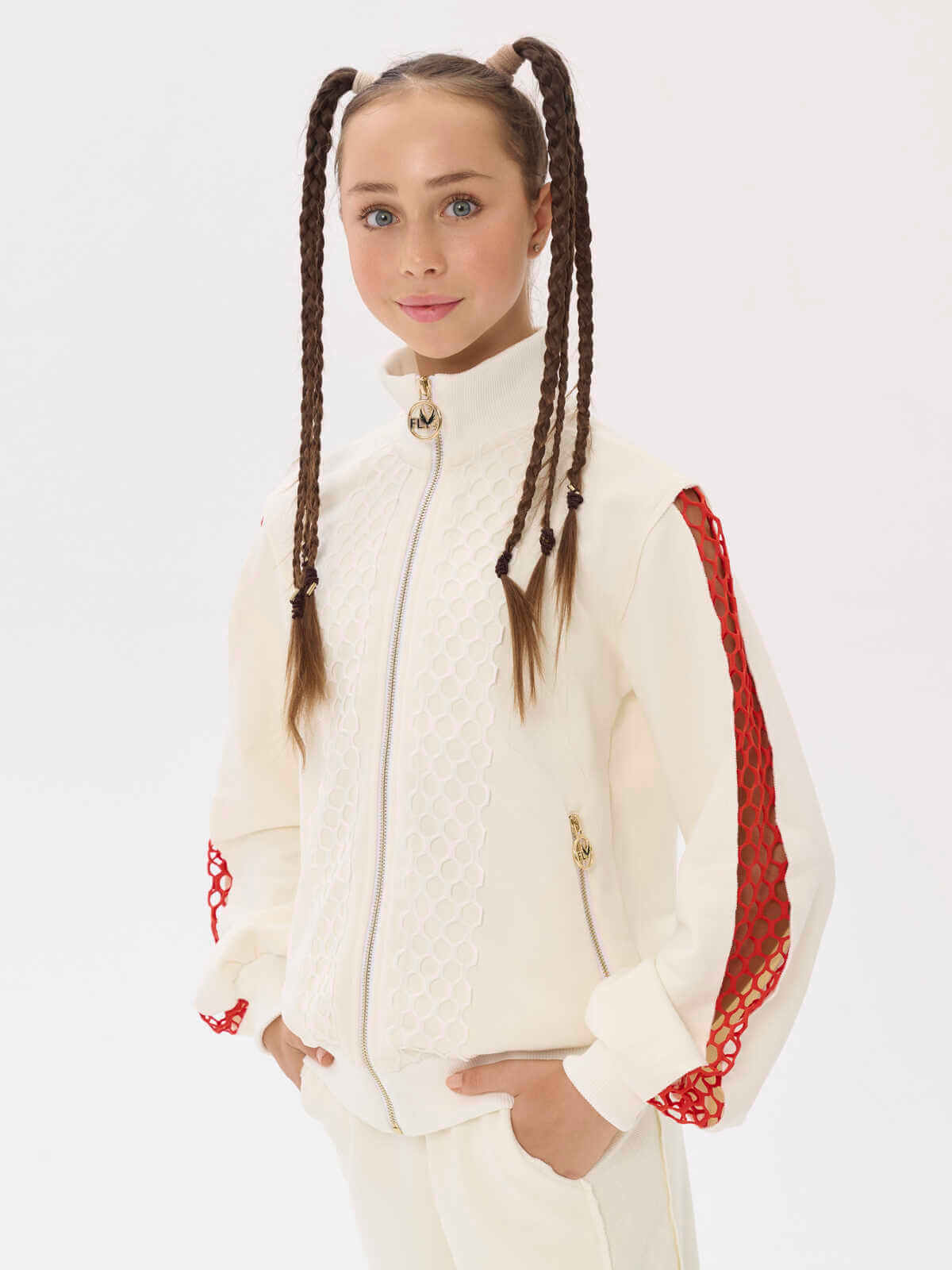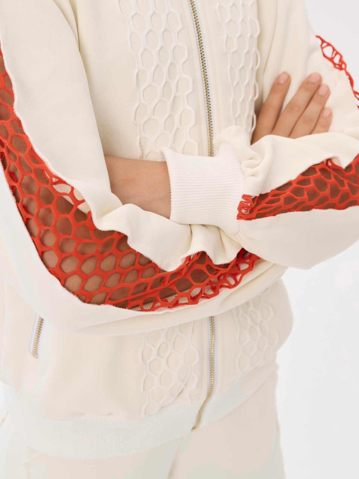The suit is off-white and decorated with a large mesh detail down the center and brightly colored detailing on the sleeves.