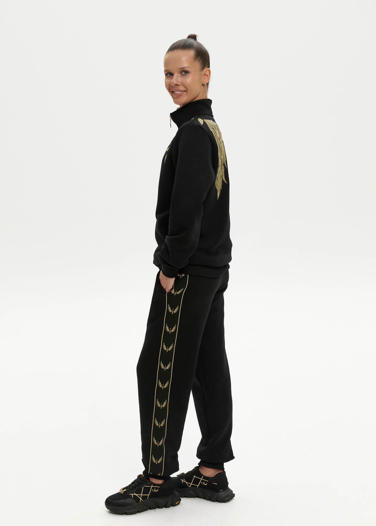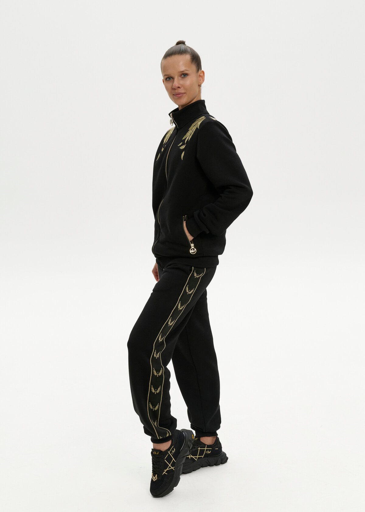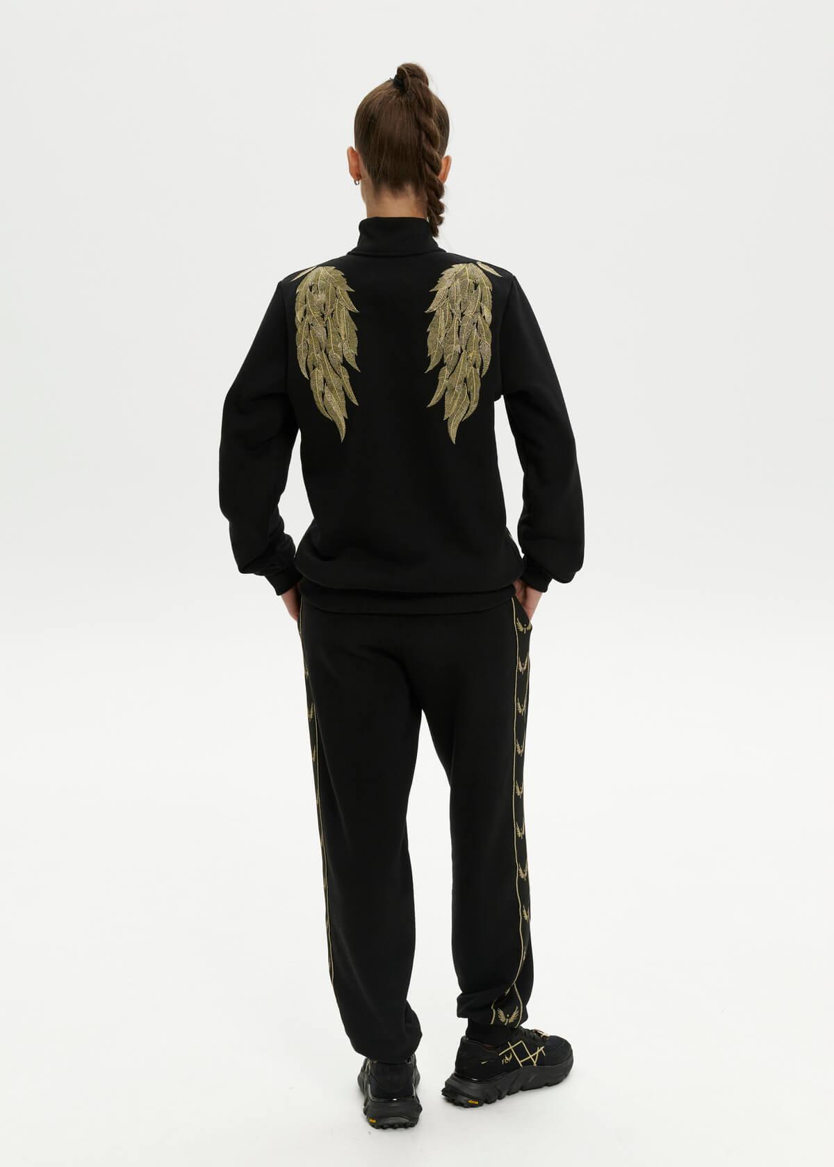 A black insulated suit with large gold wings embroidered on the back and feathers on the front. Pants with signature stripes. Initials of up to three letters can be embroidered on the sleeve.