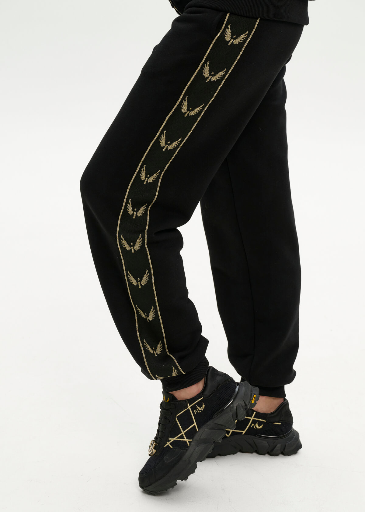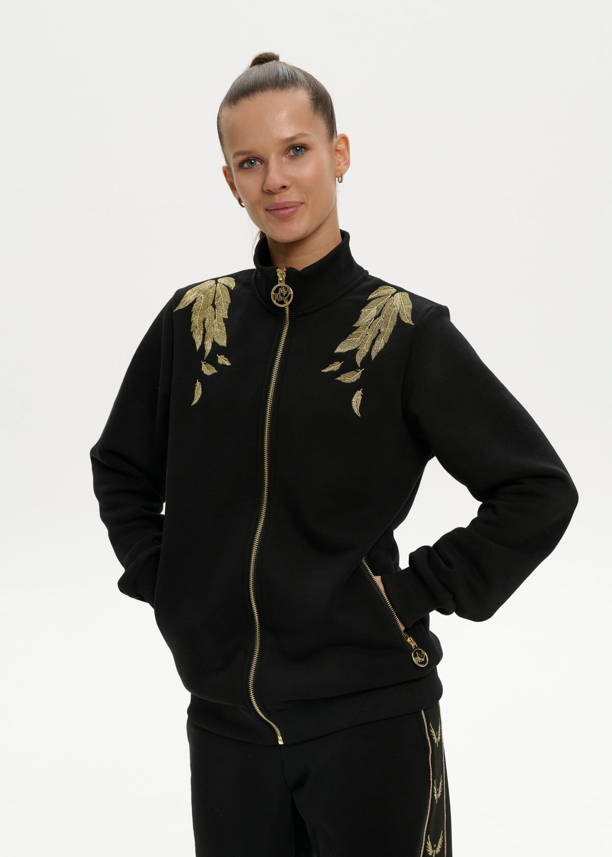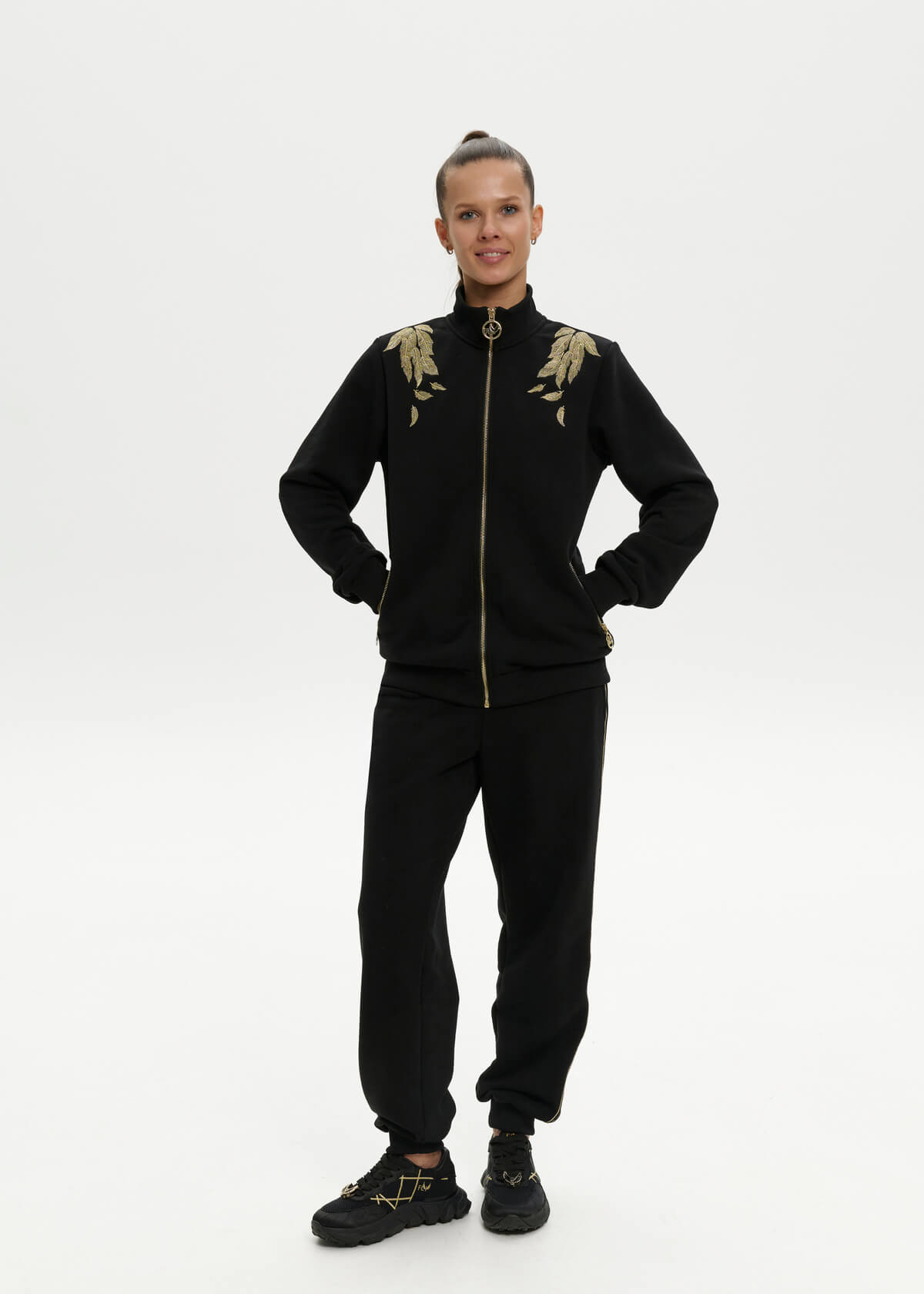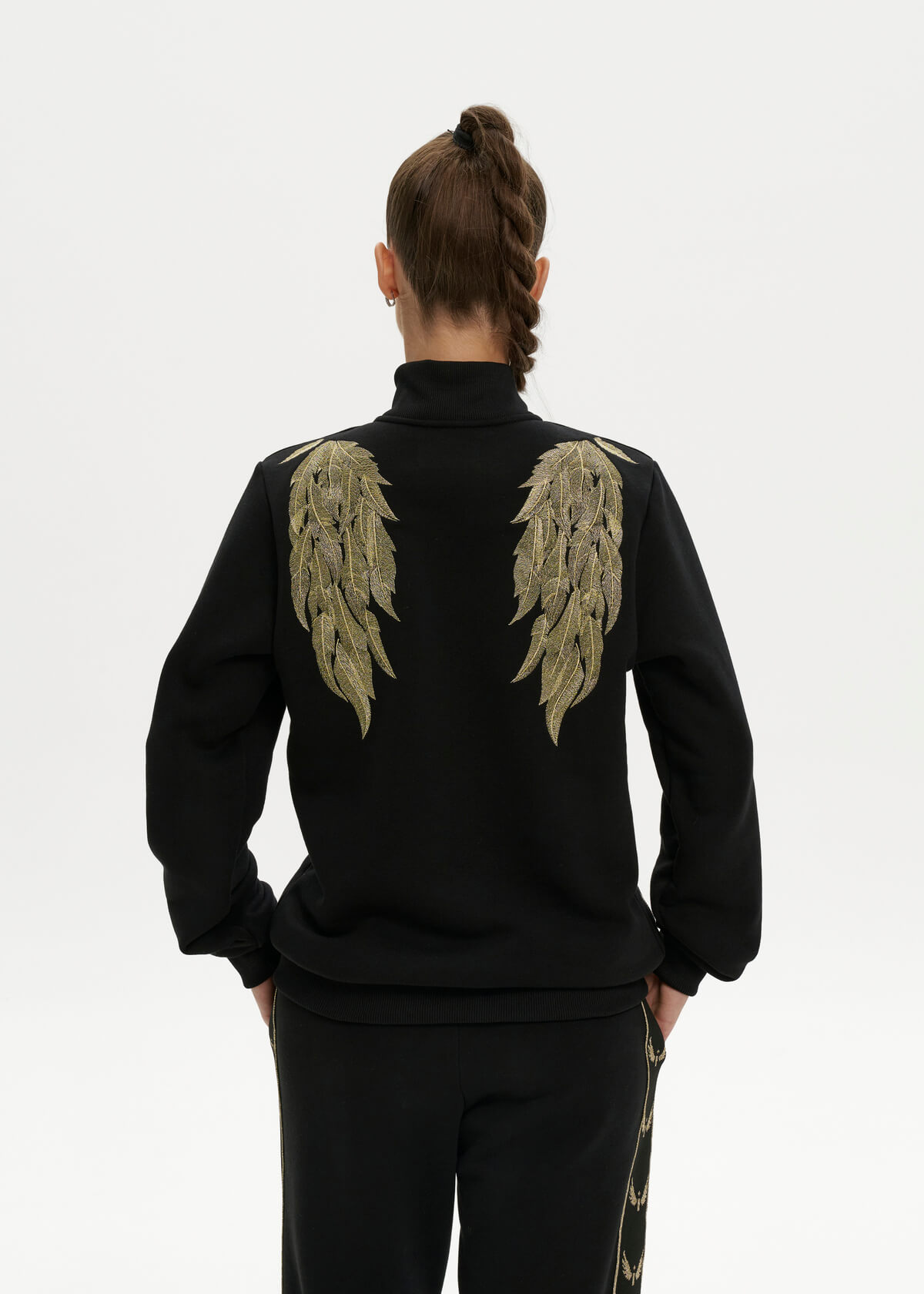 A black insulated suit with large gold wings embroidered on the back and feathers on the front. Pants with signature stripes. Initials of up to three letters can be embroidered on the sleeve.