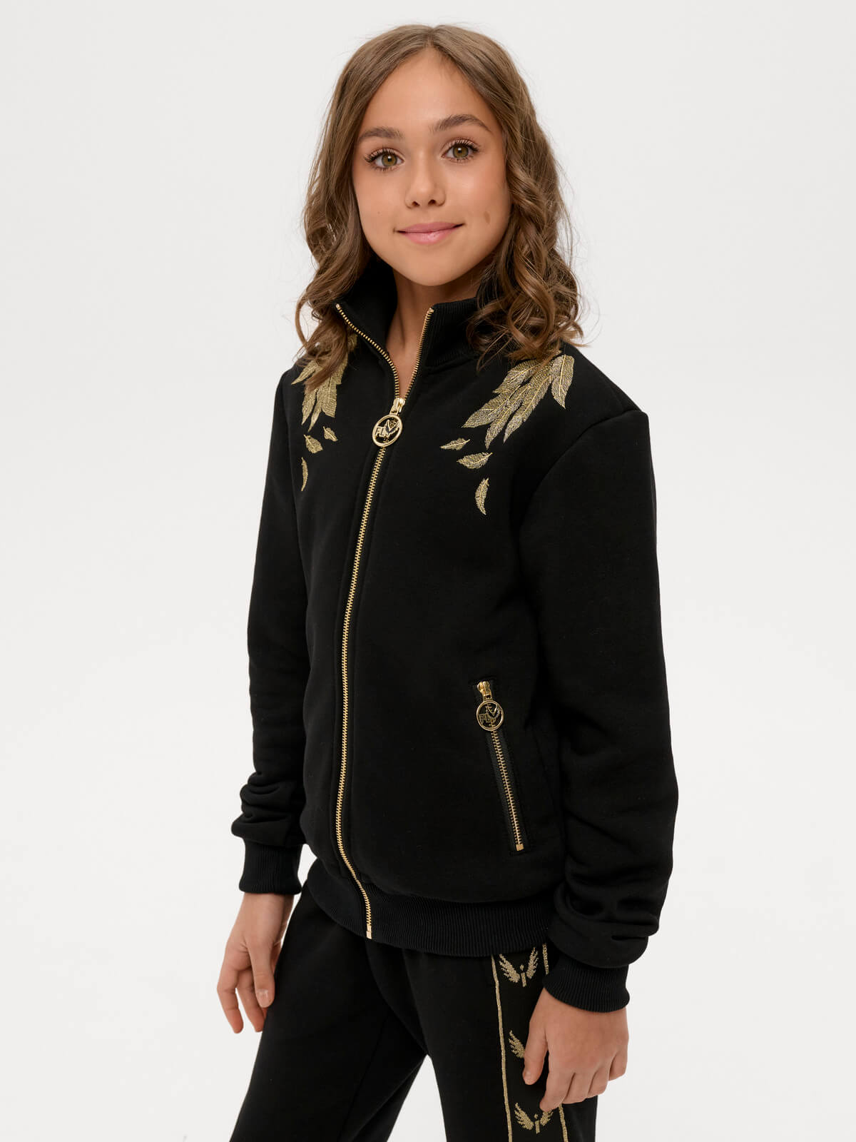 A black insulated suit with large gold wings embroidered on the back and feathers on the front. Pants with signature stripes. Initials of up to three letters can be embroidered on the sleeve.