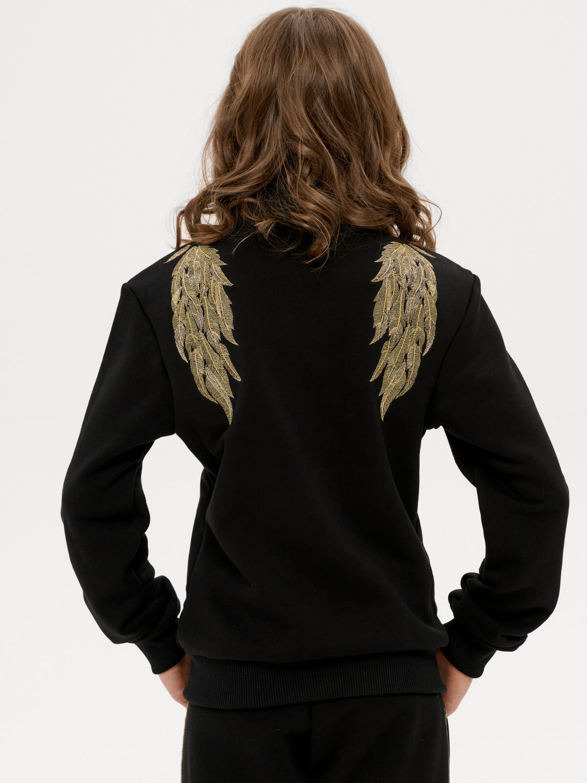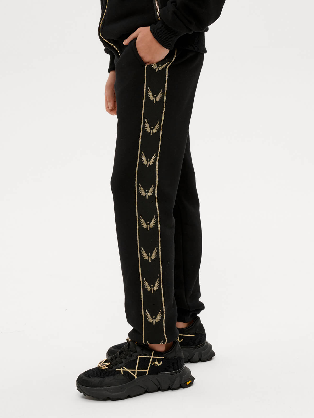 A black insulated suit with large gold wings embroidered on the back and feathers on the front. Pants with signature stripes. Initials of up to three letters can be embroidered on the sleeve.