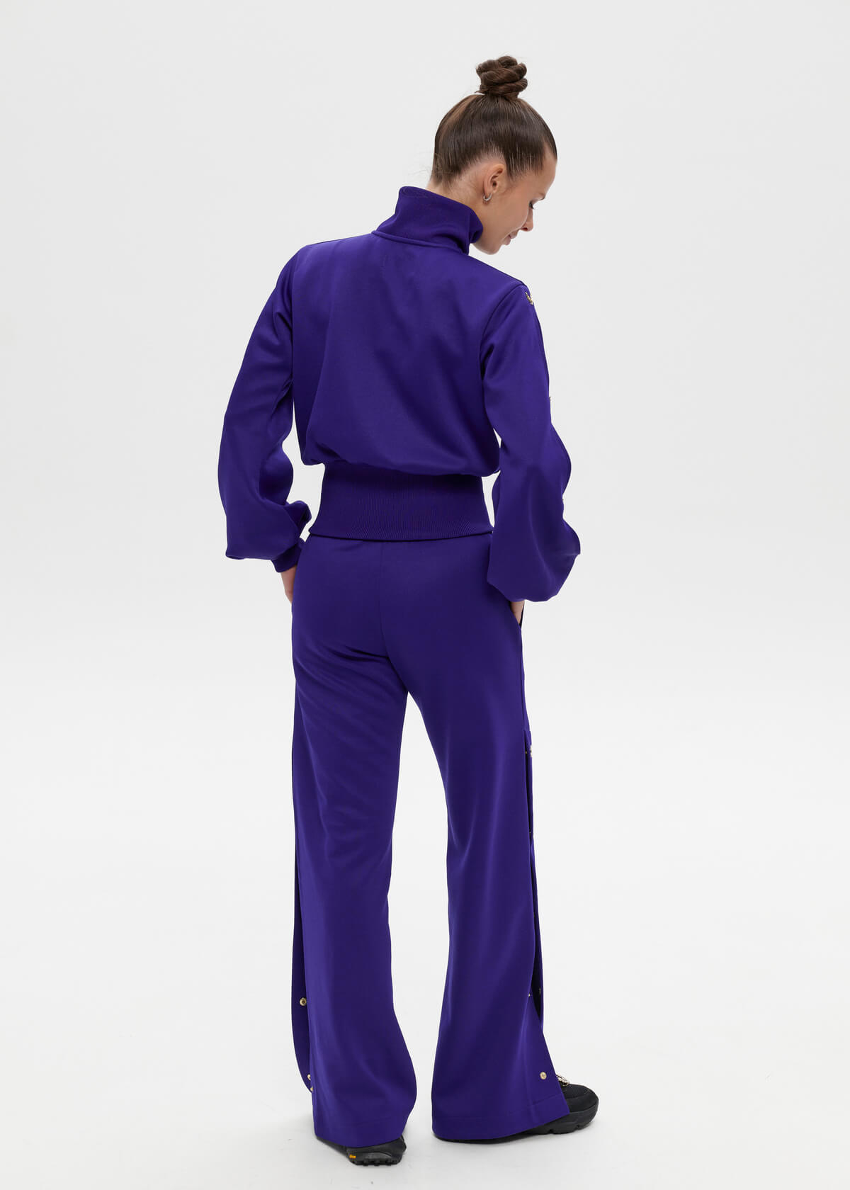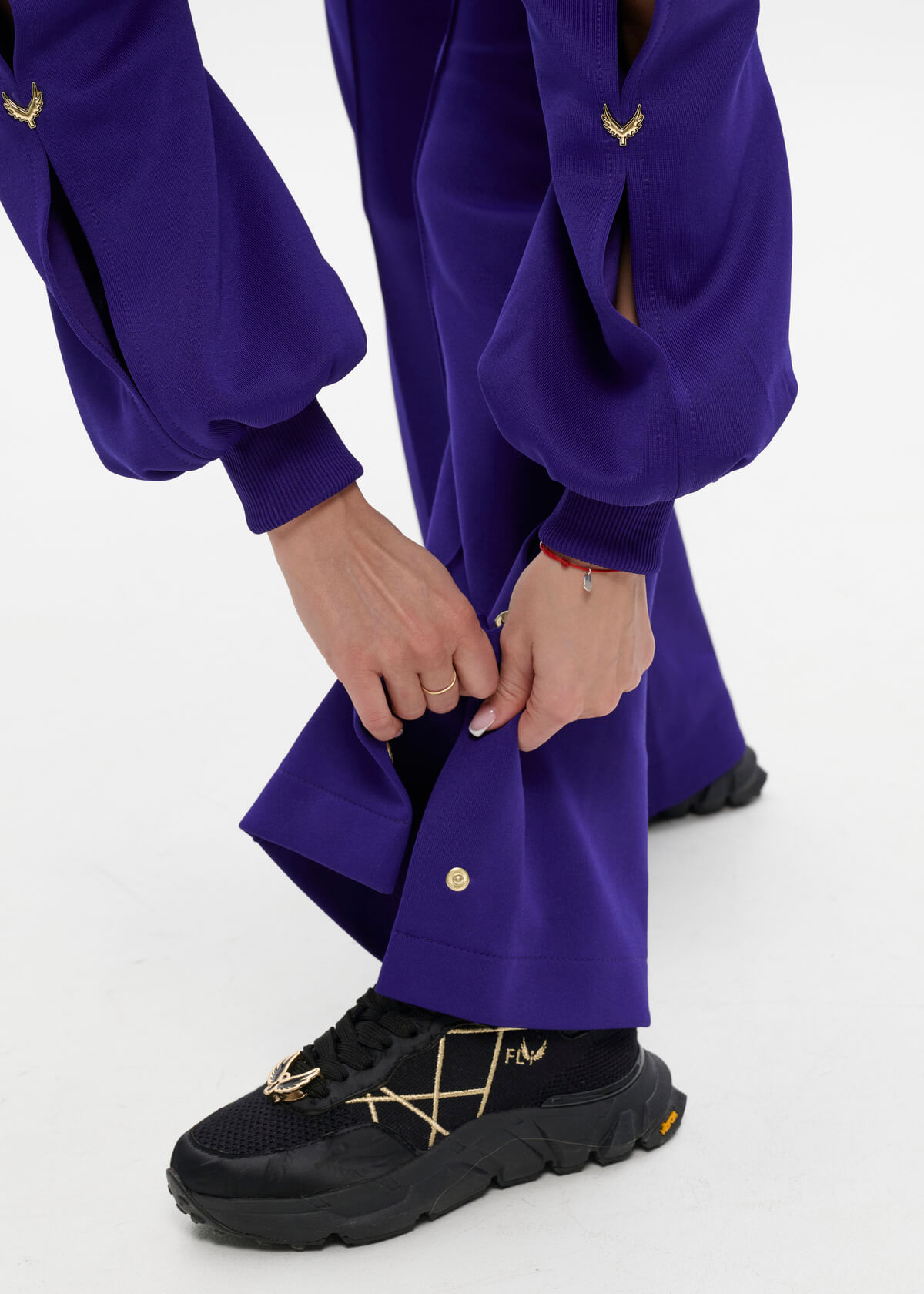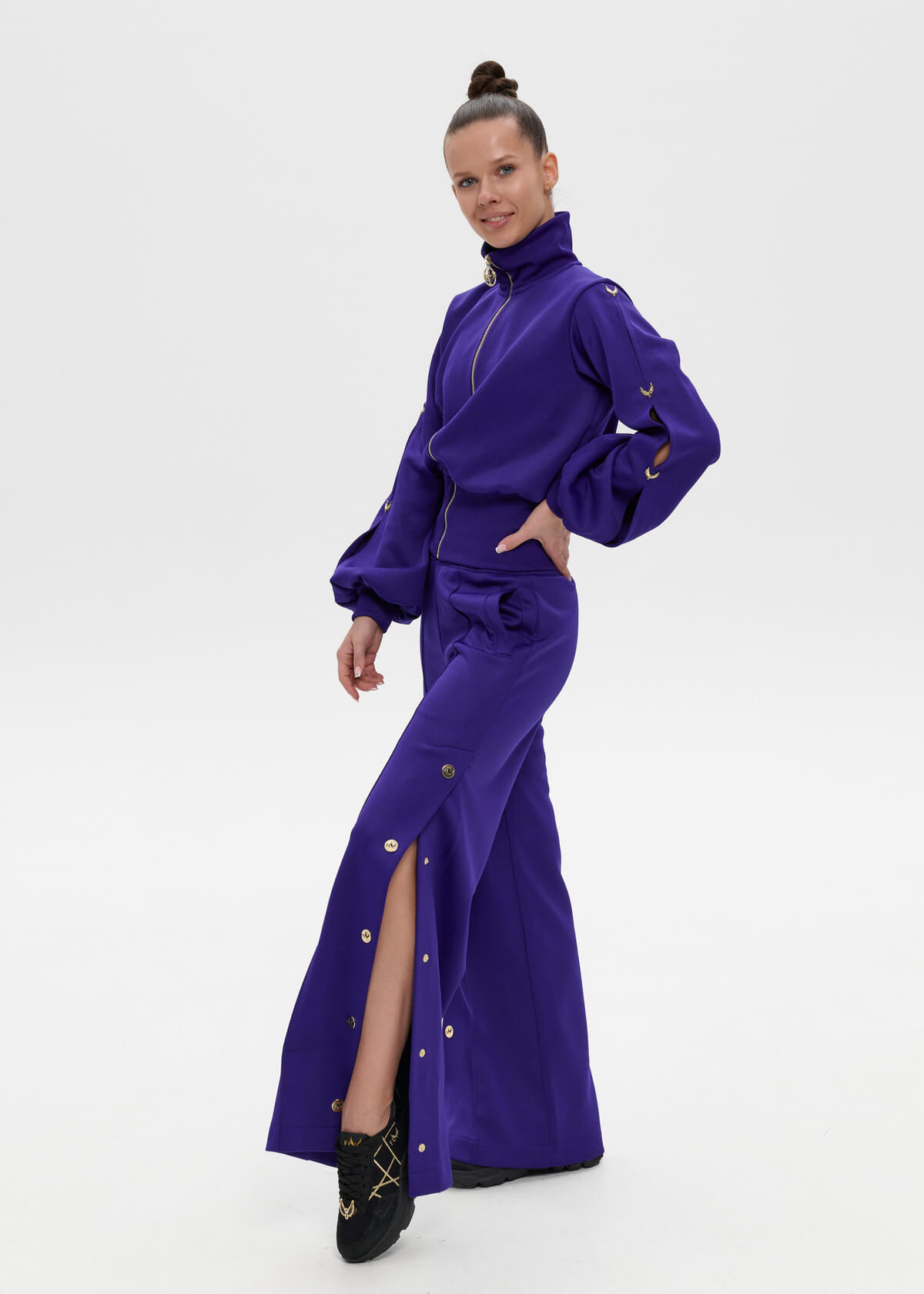 Style, grace, sophistication. Sleeves that flare out at the bottom, cuffs, loose trousers with gold buttons. Meet spring fully armed with beauty and femininity! Embroidery of the last name and first name on the back.