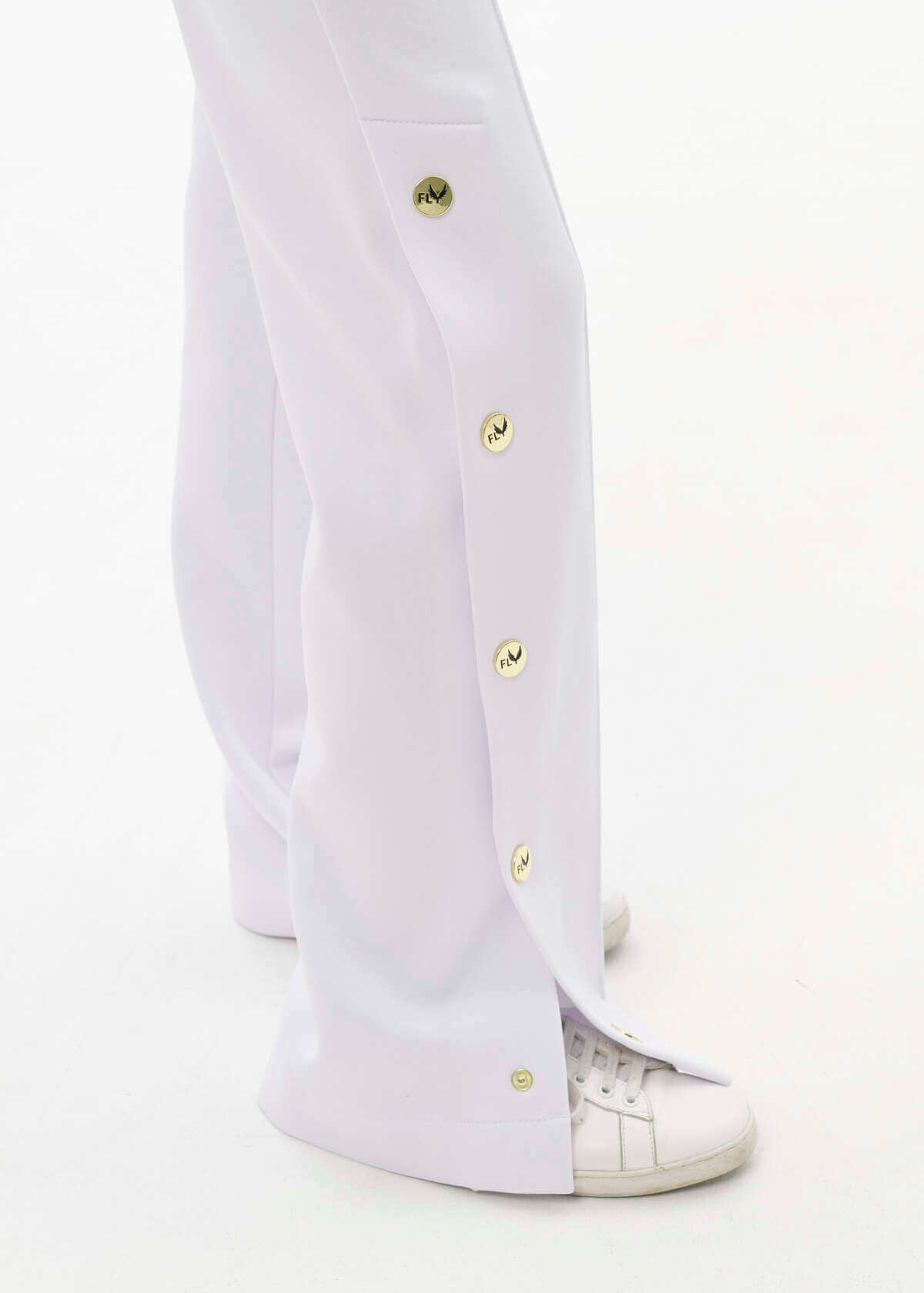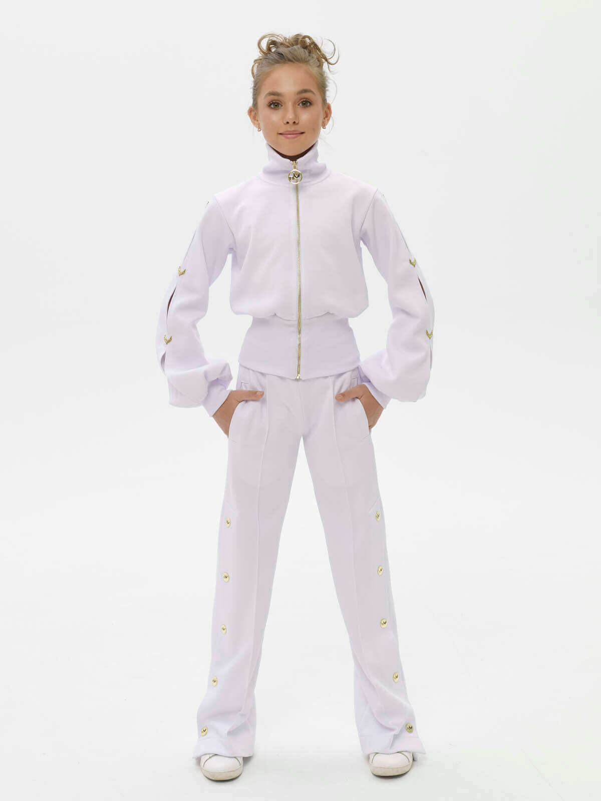Style, grace, sophistication. Sleeves that flare out at the bottom, cuffs, loose trousers with gold buttons. Meet spring fully armed with beauty and femininity! Embroidery of the last name and first name on the back.