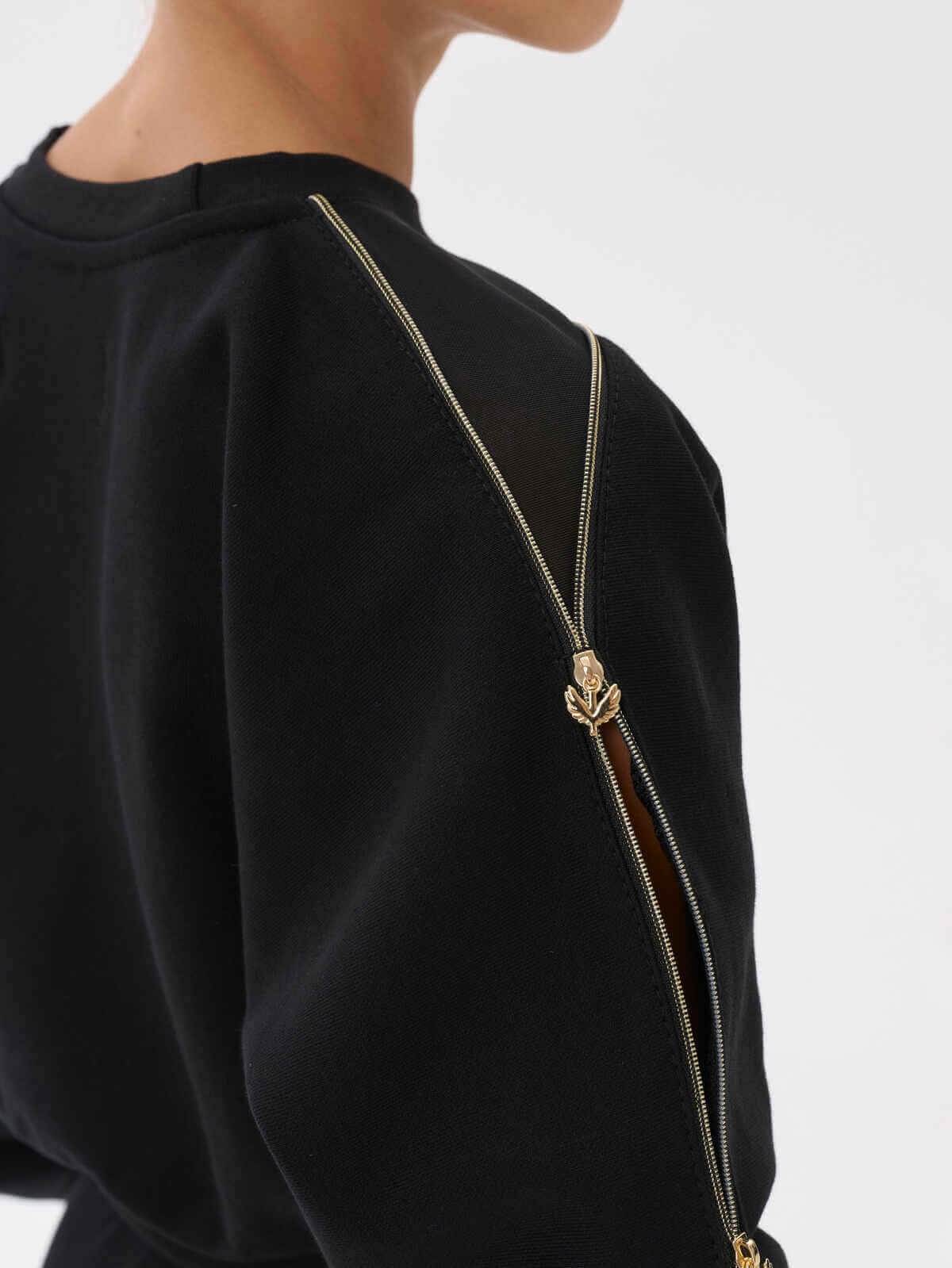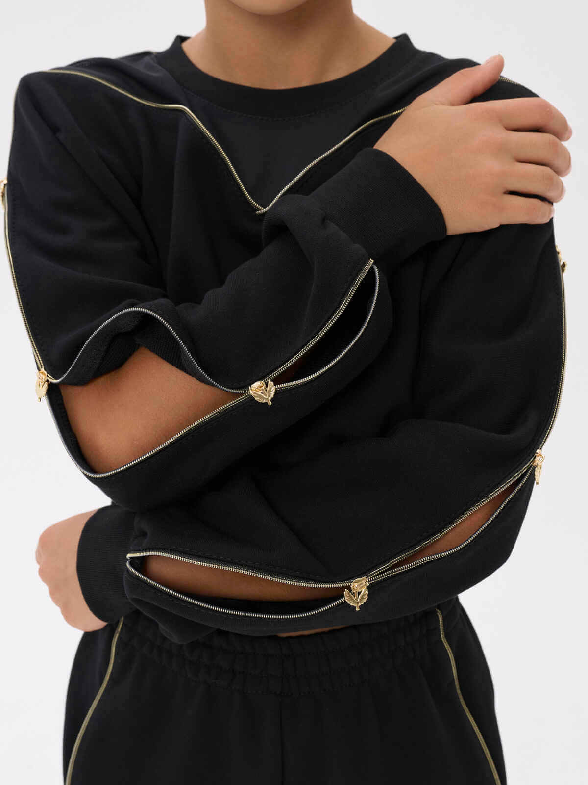 The suit consists of wide-leg trousers and a cropped hoodie with batwing sleeves. The trousers feature a stripe with signature embroidery and a decorative zipper. The front features a decorative mesh yoke and a zipper. The color is black. Sizes up to 165 cm (hip circumference 90 cm!)