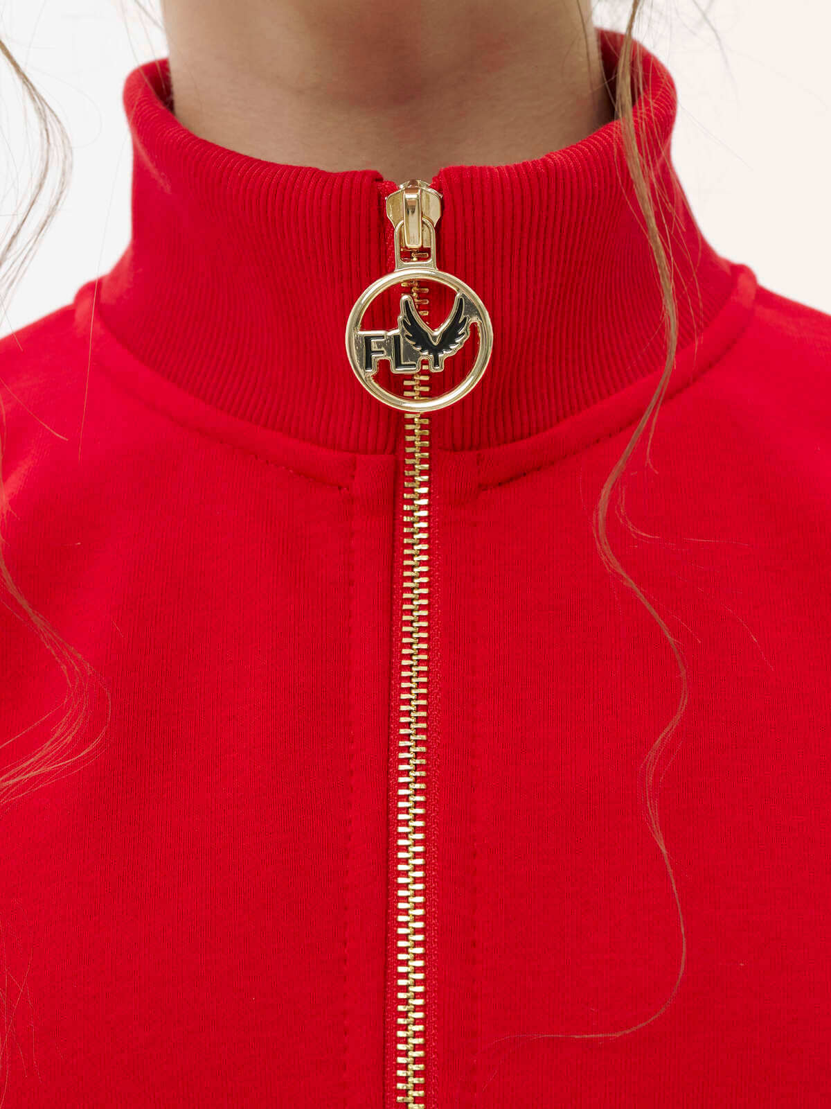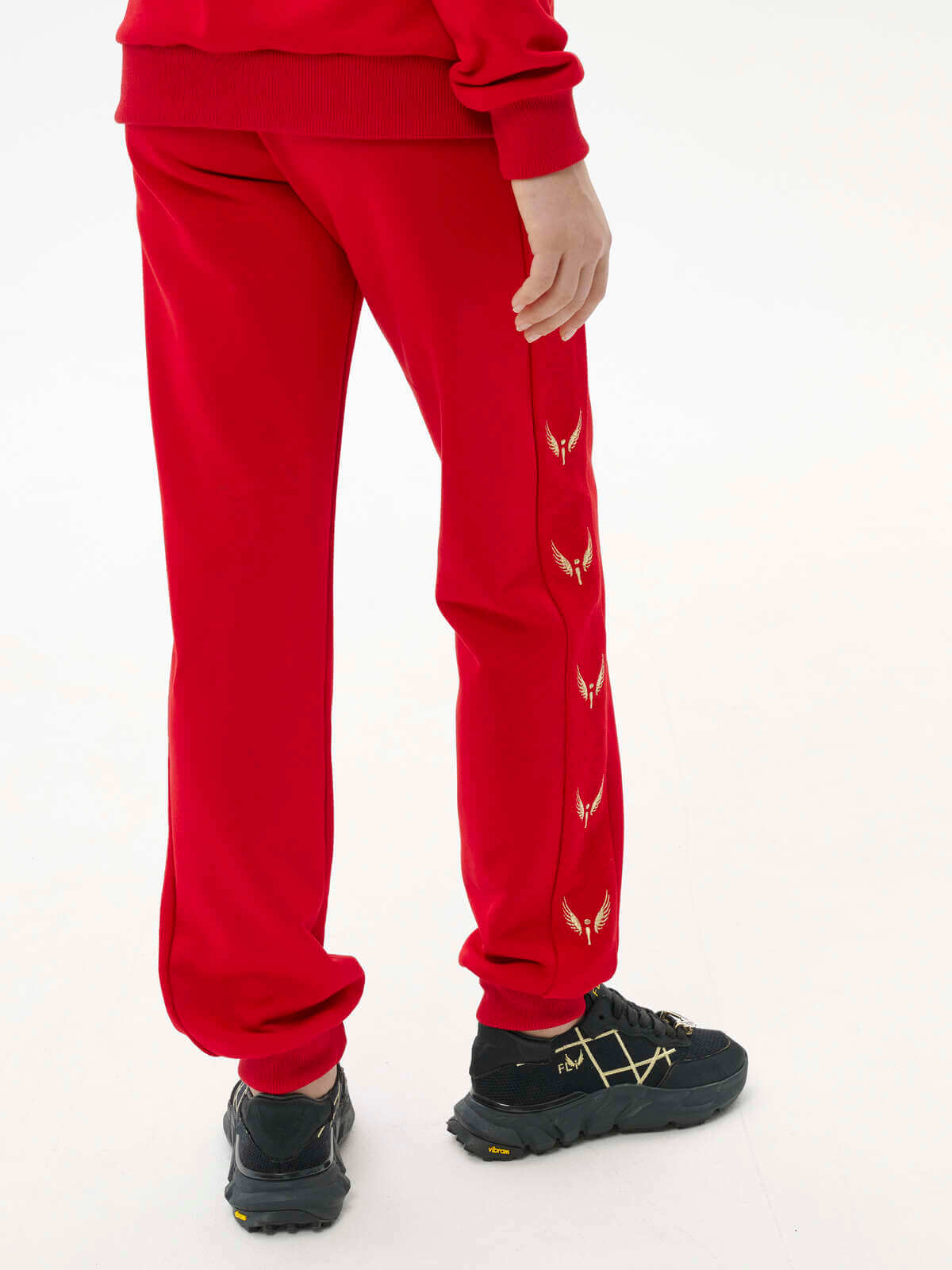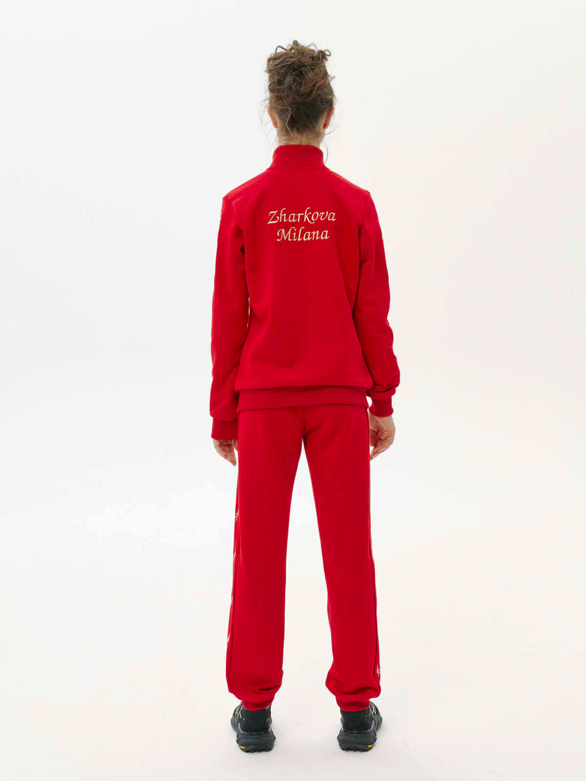 This red suit consists of trousers and a sweatshirt. The trousers have cuffs, side stripes with signature embroidery, side pockets, and an elastic waistband. The sweatshirt has a signature zipper at the front and pockets. Signature wing embroidery is featured on the sleeves. A first and last name can be embroidered on the chest or back.