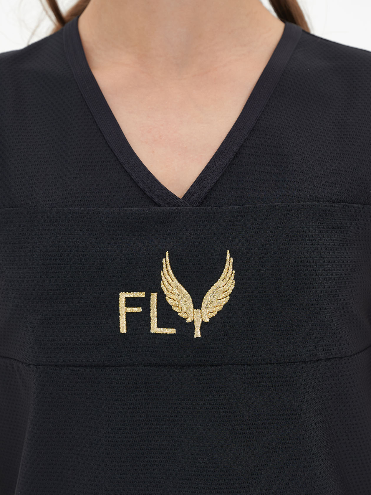 Sport mesh two-piece set in black with gold FLY logo embroidery