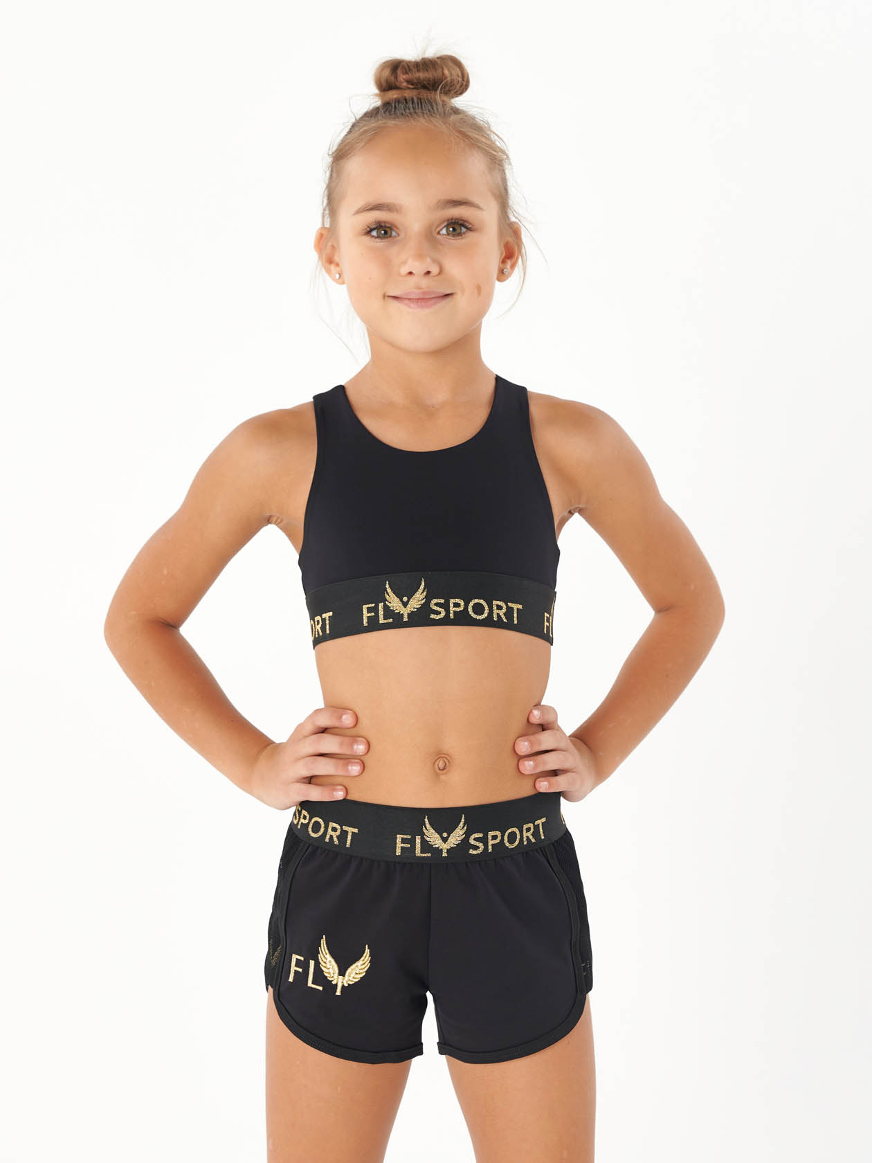 Single layer shorts in black, finished with lightweight Italian mesh, with FLY gold branded waistband