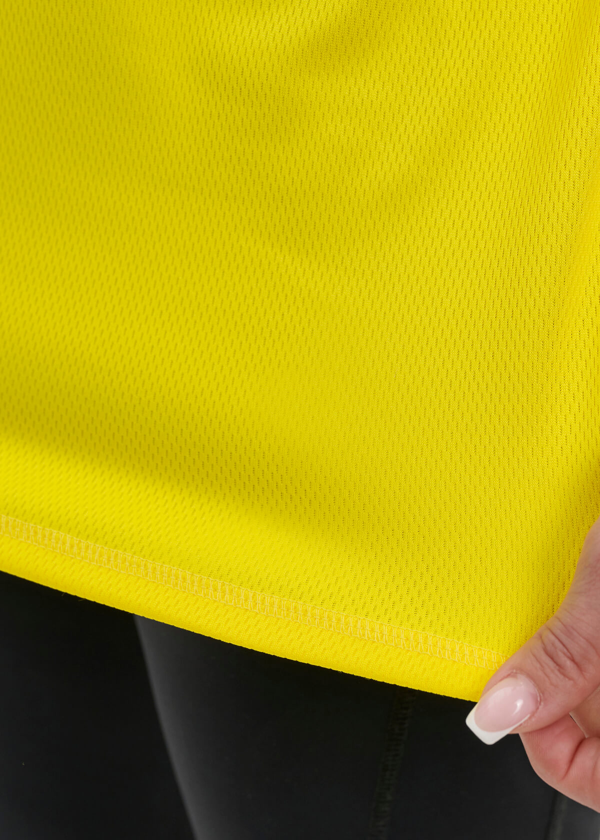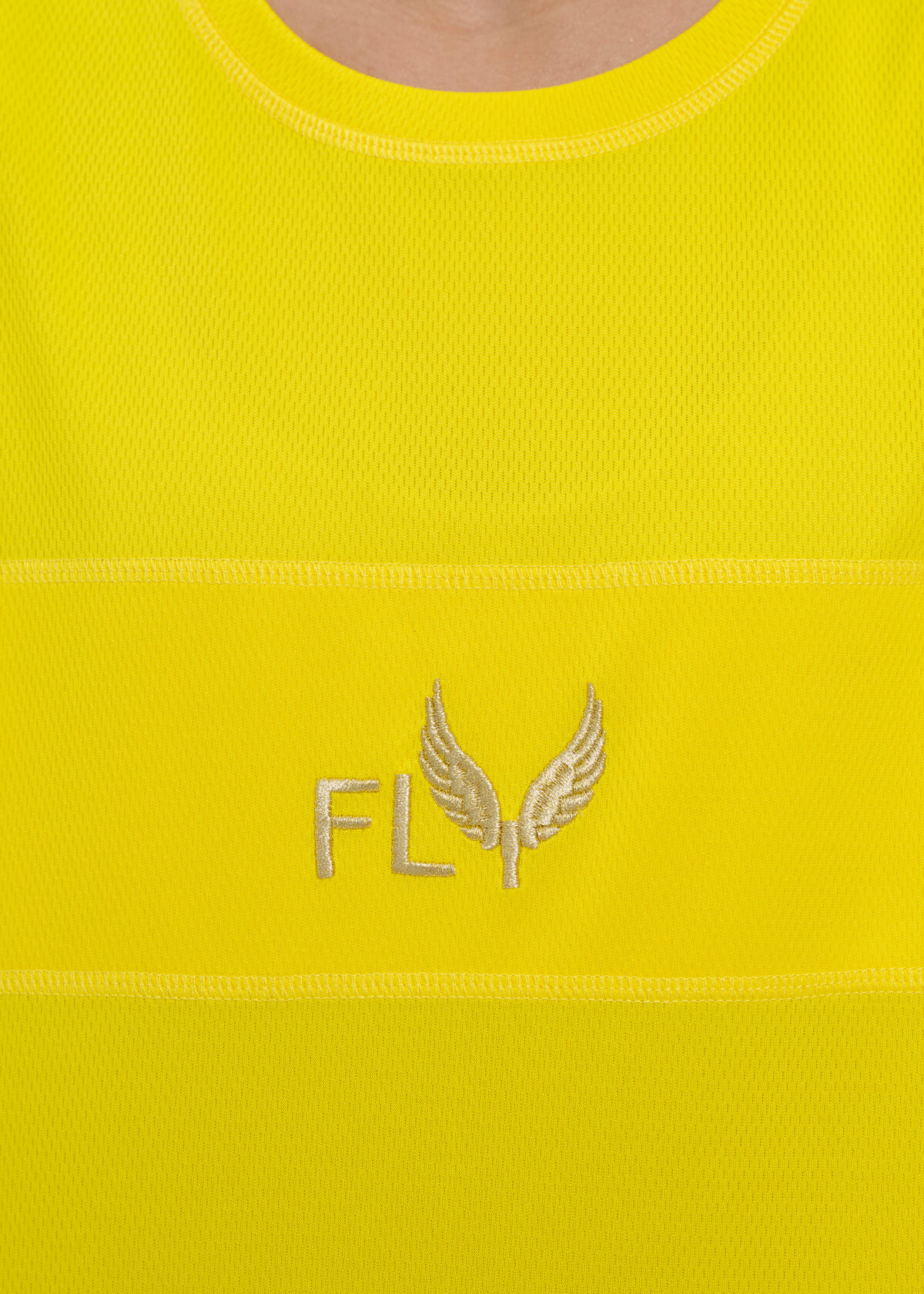 The color is yellow. The material is very lightweight and perforated. The silhouette is loose. Up to three initials are embroidered at the front bottom.
