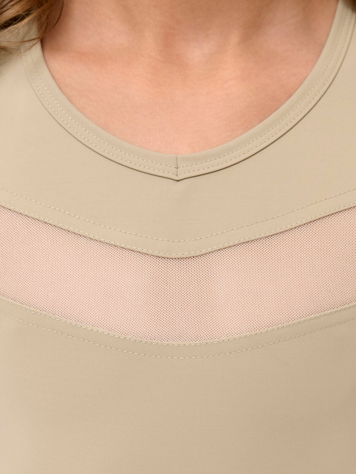 A girls' training set consisting of a top and breeches. The top features a decorative mesh insert at the front and signature embroidery at the back. A wide belt secures the top at the hem. The breeches have a matching stripe with signature embroidery on the stripe. A wide belt secures the breeches at the waist. Customization is technically not possible.