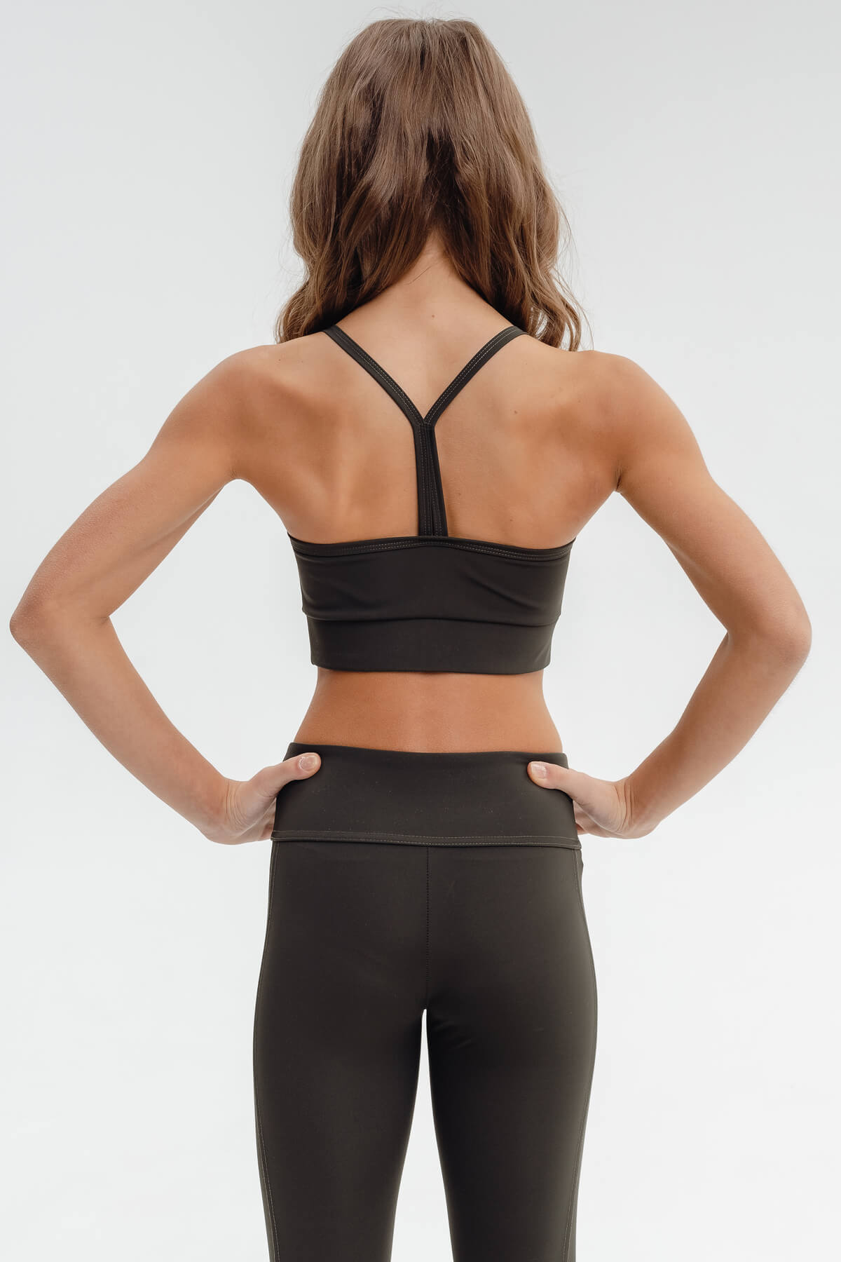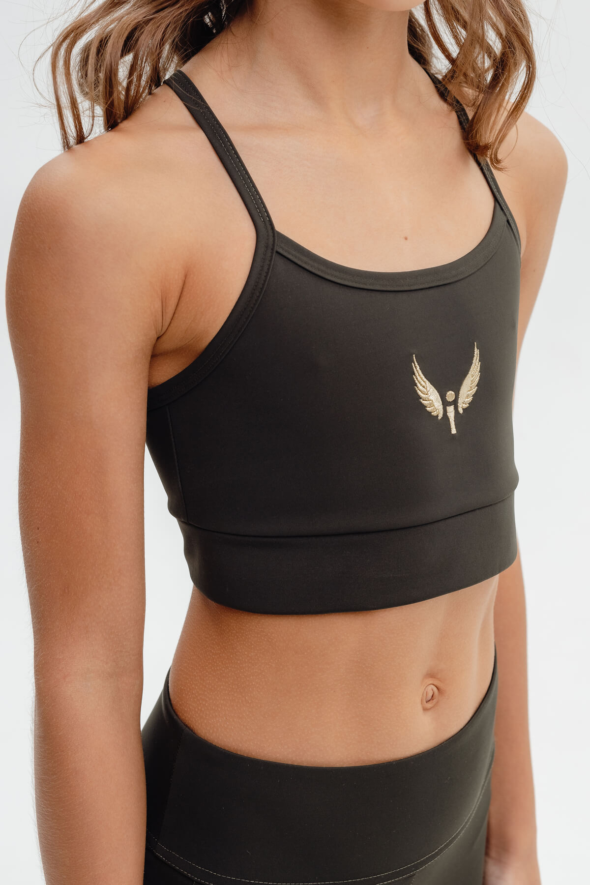 Leggings and top set. The top has thin straps that meet at the back. The top features signature embroidery on the front. The leggings are ankle-length. Side stripes feature signature embroidery. Sizes range from 100 to 155 cm (hips up to 80 cm!!). Customization is technically not possible.