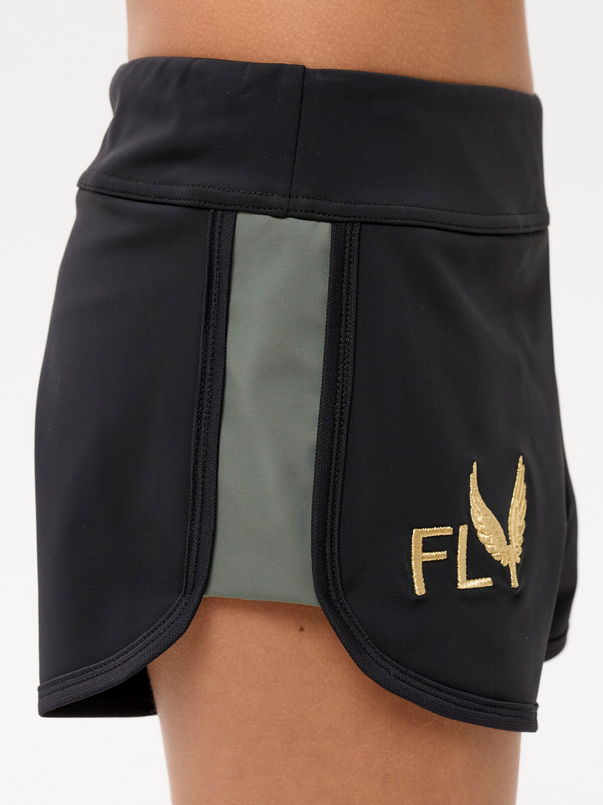 A shorts and top set. The top features signature embroidery at the front, three thin straps extending from the shoulder and crossing at the back. The shorts have matching stripes and signature embroidery at the front. The first and last name are embroidered on the shorts.